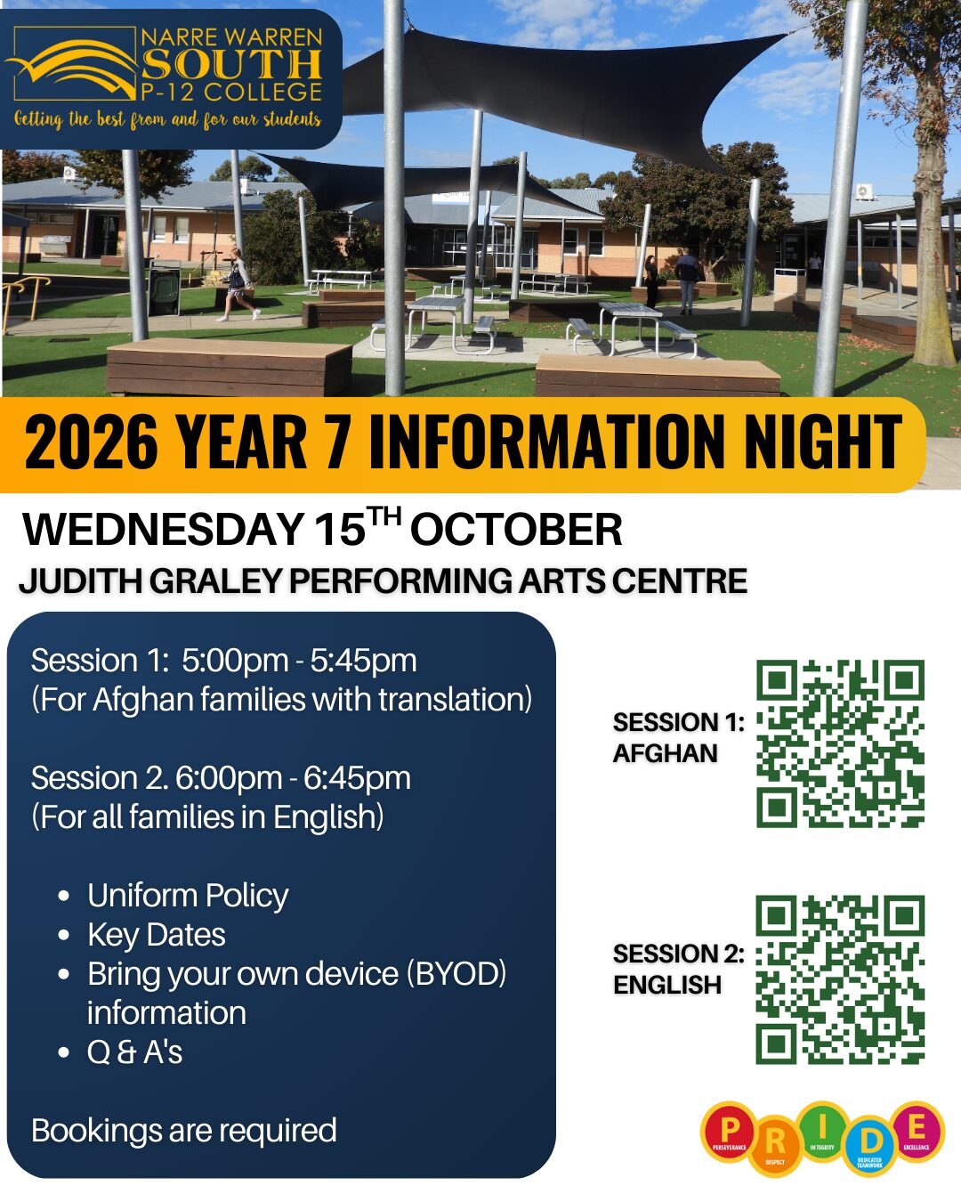 On Wednesday 15th of October, we will be hosting a Year 7 Information Night at the Judith Graley Performing Arts Centre at the College, with two separate sessions to accommodate all families: