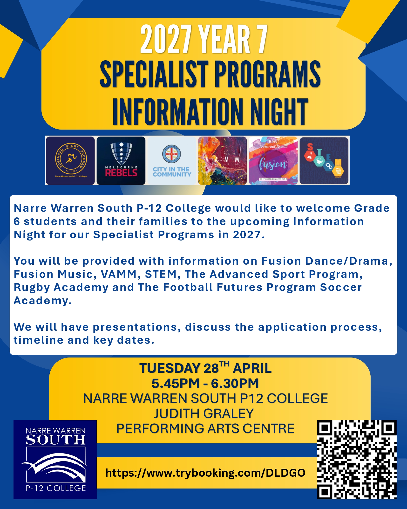 Narre Warren South P-12 College would like to welcome Grade 6 students and their families to the upcoming Information Night for our Specialist Programs in 2026. You will be provided with further information on Fusion Dance/Drama, Fusion Music, VAMM, STEM, The Advanced...